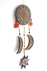 Decorative Wind Chime made of wood with a design inspired by the Inca Culture. It has prints with "Chakanas" also known as the "Inca Cross" which is a recurrent millenarian symbol in the original cultures of the Andes. The Chakana has the shape of a square and stepped cross with 12 points. Its pyramidal form with stairs on all four sides represents the union between the sun and the earth, the man and the superior divinity, it is then a ladder towards the highest. Its geometric shape comes as a result of the astronomical observation of the ancient inhabitants. It is a symbol that summarizes the universe. The symbol has opposite components that explain the Cosmogony of the Andean world: masculine and feminine, sky and earth, sun and moon, north and south, high and low, time and space. The cross shape represents the four directions and the four seasons. Each segment, formed by three steps on each side represent the three worlds: the world of the gods, the present world or of men and the world of the dead.